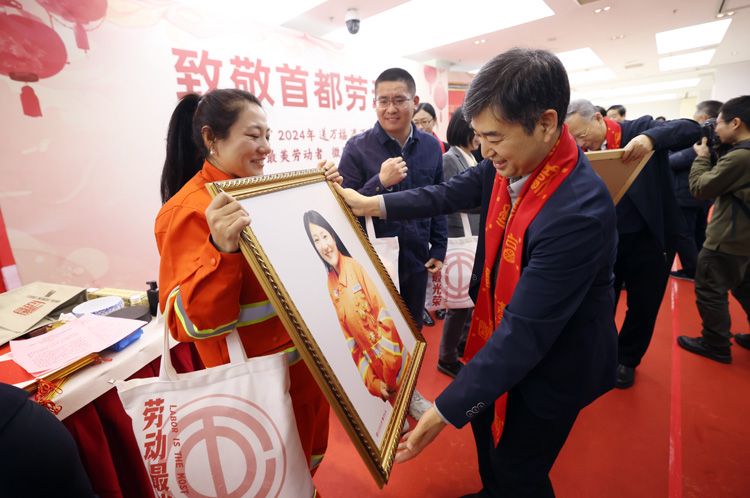 活动现场,30位劳模工匠代表获赠记录各自工作镜头的最美劳动者微笑照和装有手套、围巾、保温杯等的新春福包。