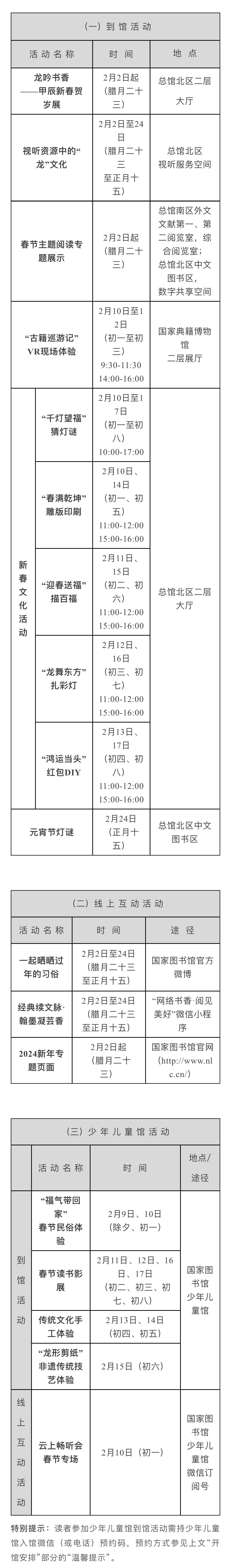 新京报讯 据国家图书馆服务号消息,根据《国务院办公厅关于2024年部分节假日安排的通知》精神,现将我馆春节期间开馆及活动安排公告如下: