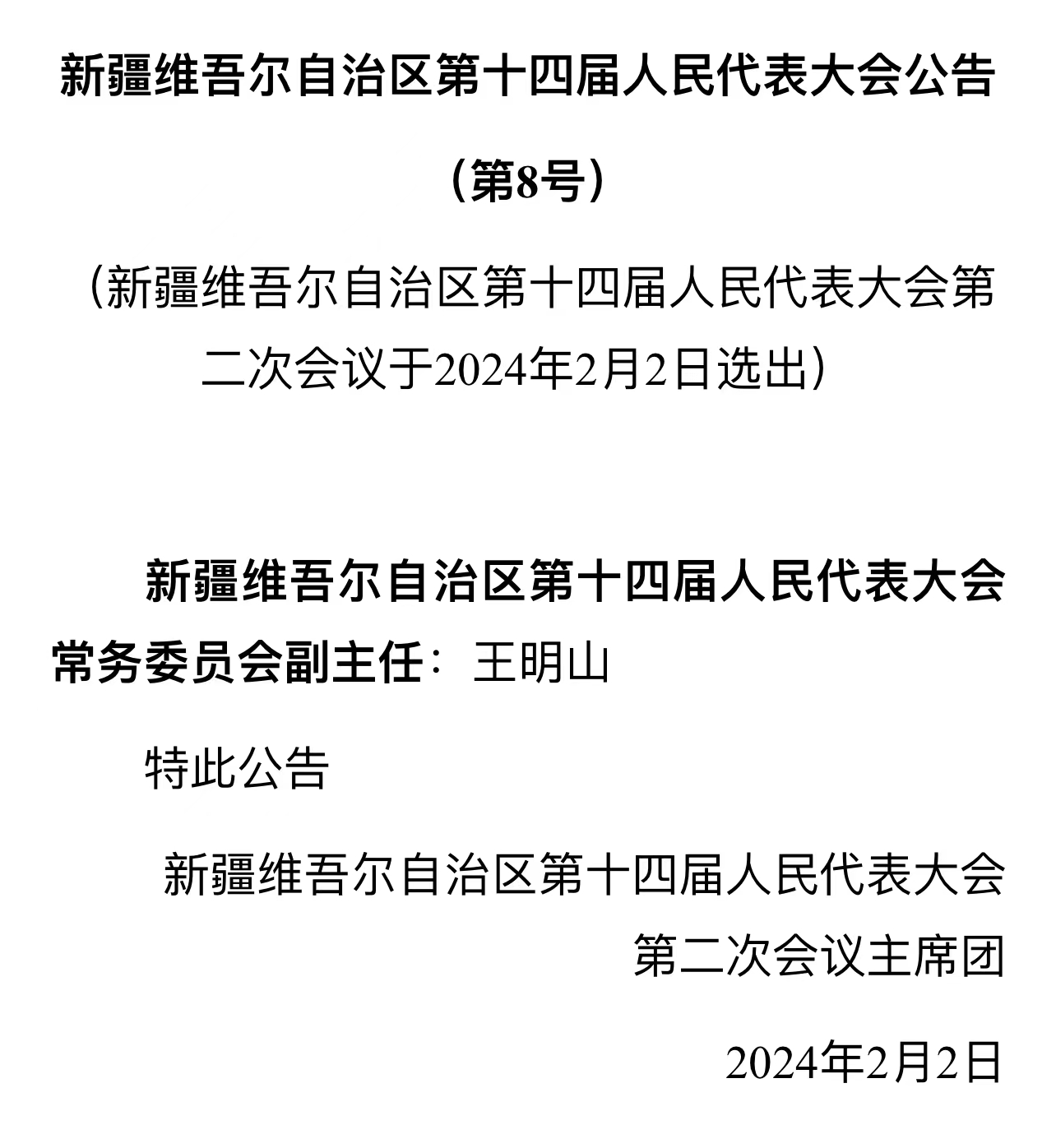 据新疆日报消息,2月2日,新疆维吾尔自治区第十四届人民代表大会公告发布。王明山当选新疆维吾尔自治区第十四届人民代表大会常务委员会副主任。公告全文如下: