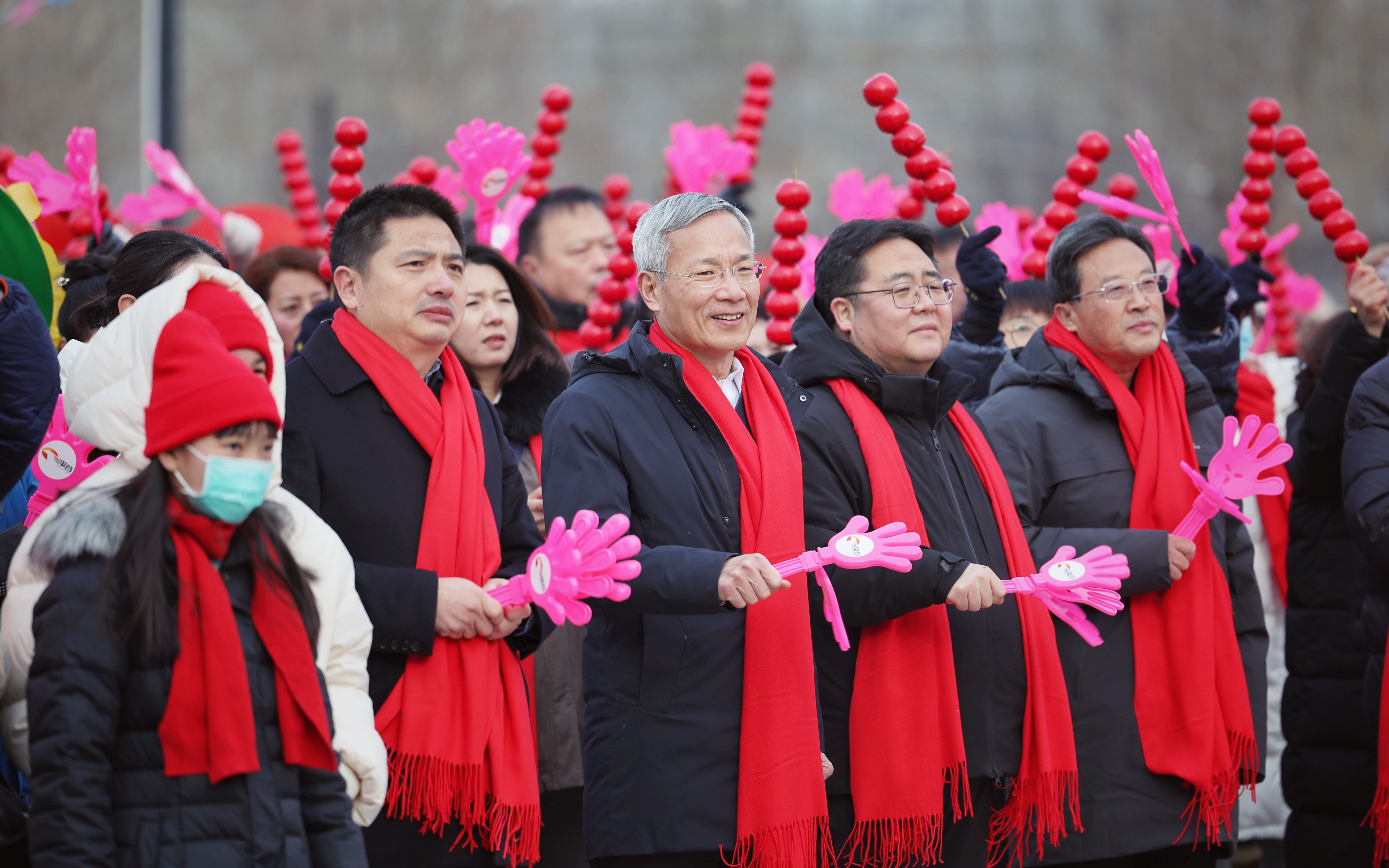 平谷区委书记唐海龙(中)带领区四套班子领导观看演出,并向全区父老乡亲拜年。新京报记者 薛珺 摄