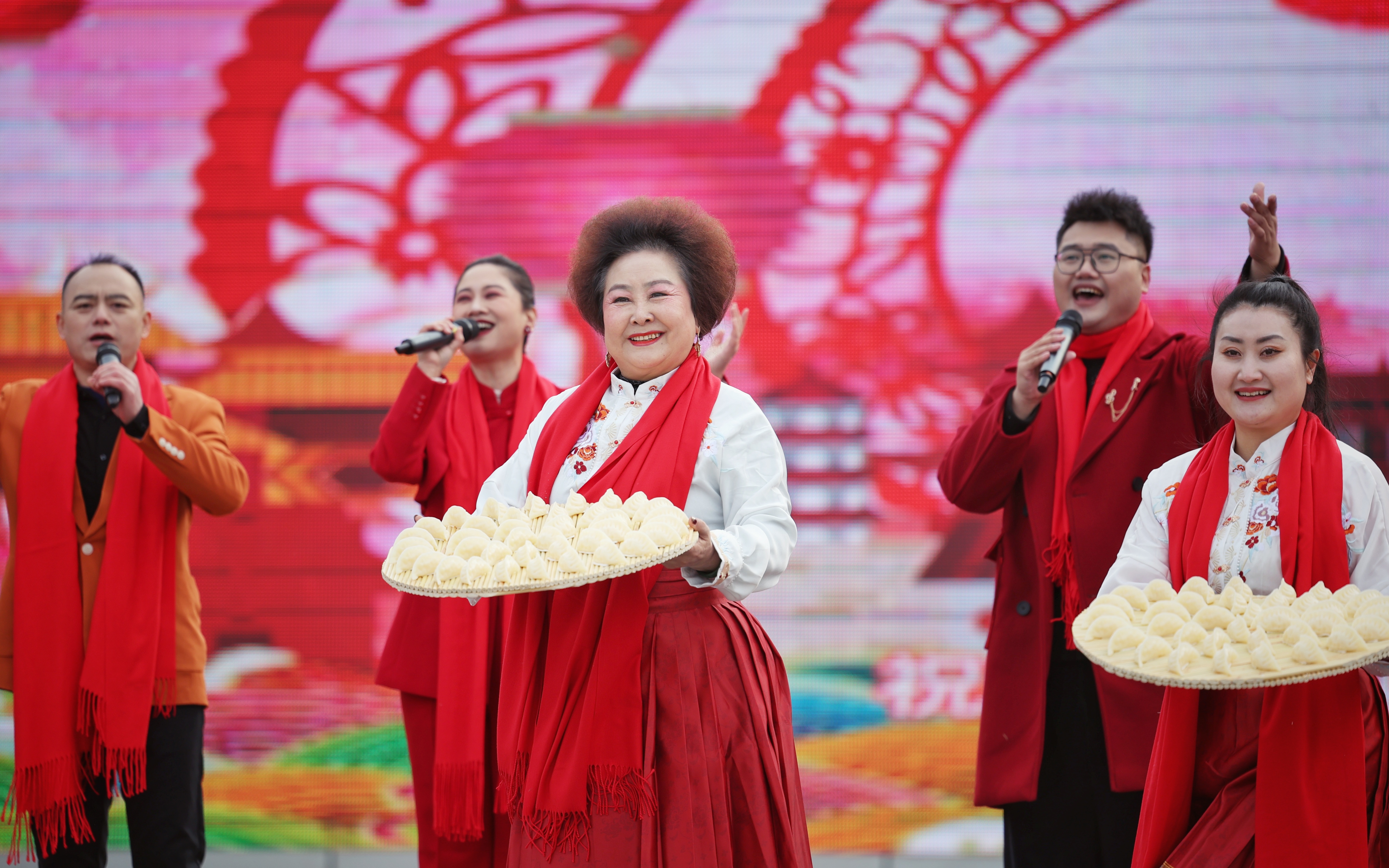 “龙腾盛世迎新春”拜年演出,演员们捧着饺子给大家拜年。新京报记者 薛珺 摄