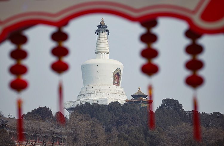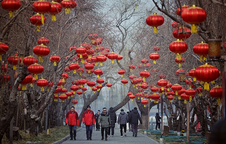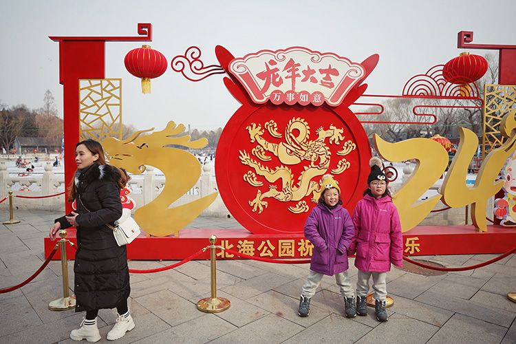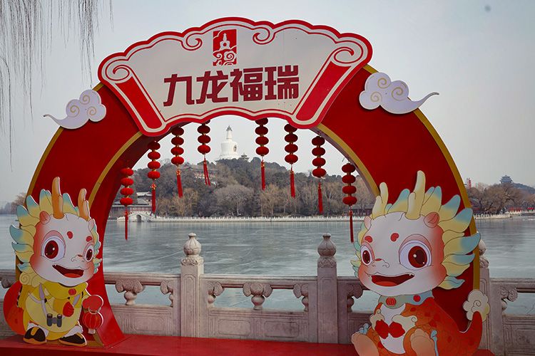 春节将至,北海公园准备了丰富的游园活动,让游客尽享新春快乐,热热闹闹,开开心心过大年。图为2月4日,北海公园,游客在喜庆的龙年新春布置前留影、游玩。