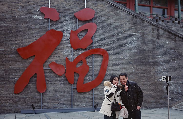 游客在大大的“福”字前留影、游玩。初一至初五,国家级非物质文化遗产白纸坊太狮队将首次在北海公园带来“新春舞狮”表演。“兔儿爷”制作、新春“送福”等活动也将让游客在公园中度过热闹欢快的春节假期。