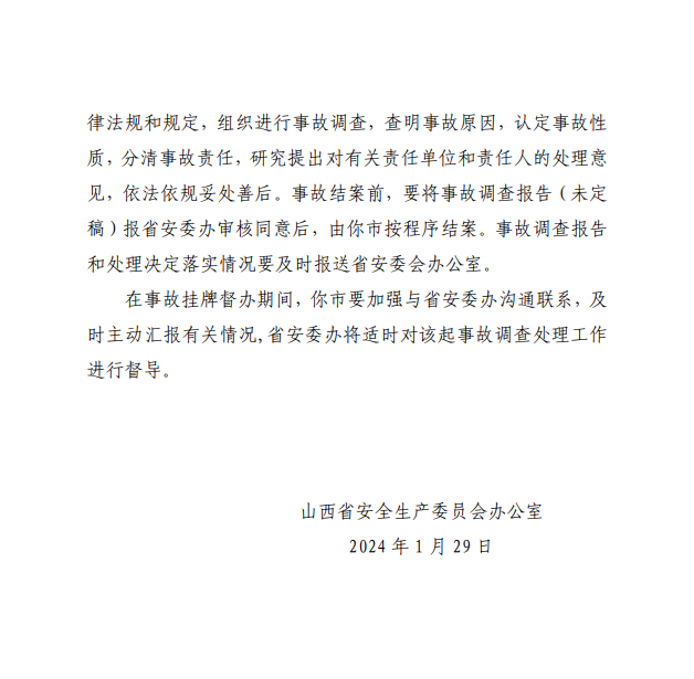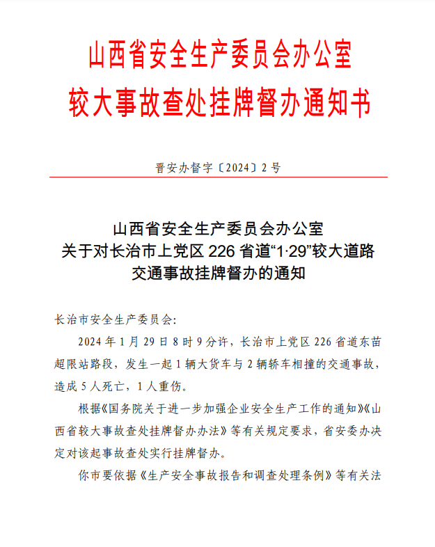 新京报讯 2月5日,山西省安全生产委员会办公室发布关于对长治市上党区226省道“1.29”较大道路交通事故挂牌督办的通知,以下为全文: