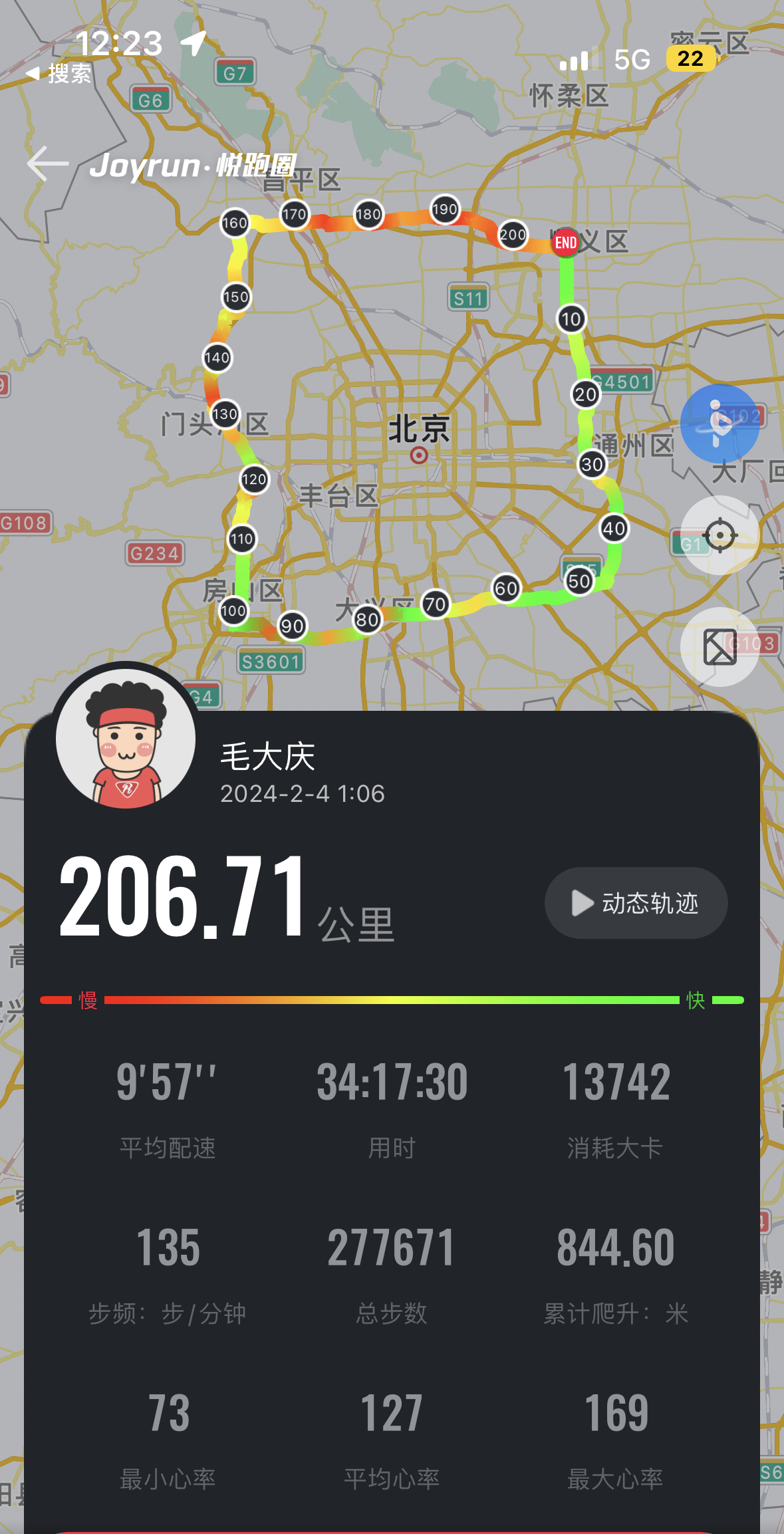 本次超级环路跑从顺义城区仁和体育广场出发,途经通州(北京城市副中心)、大兴、丰台,再经大兴、房山、门头沟、石景山、海淀、昌平,最后回到顺义仁和体育广场。中途除了两次正式用餐6个小时休整、十公里一次5分钟补给,毛大庆和接力陪跑团一气呵成跑完北京六环路。
