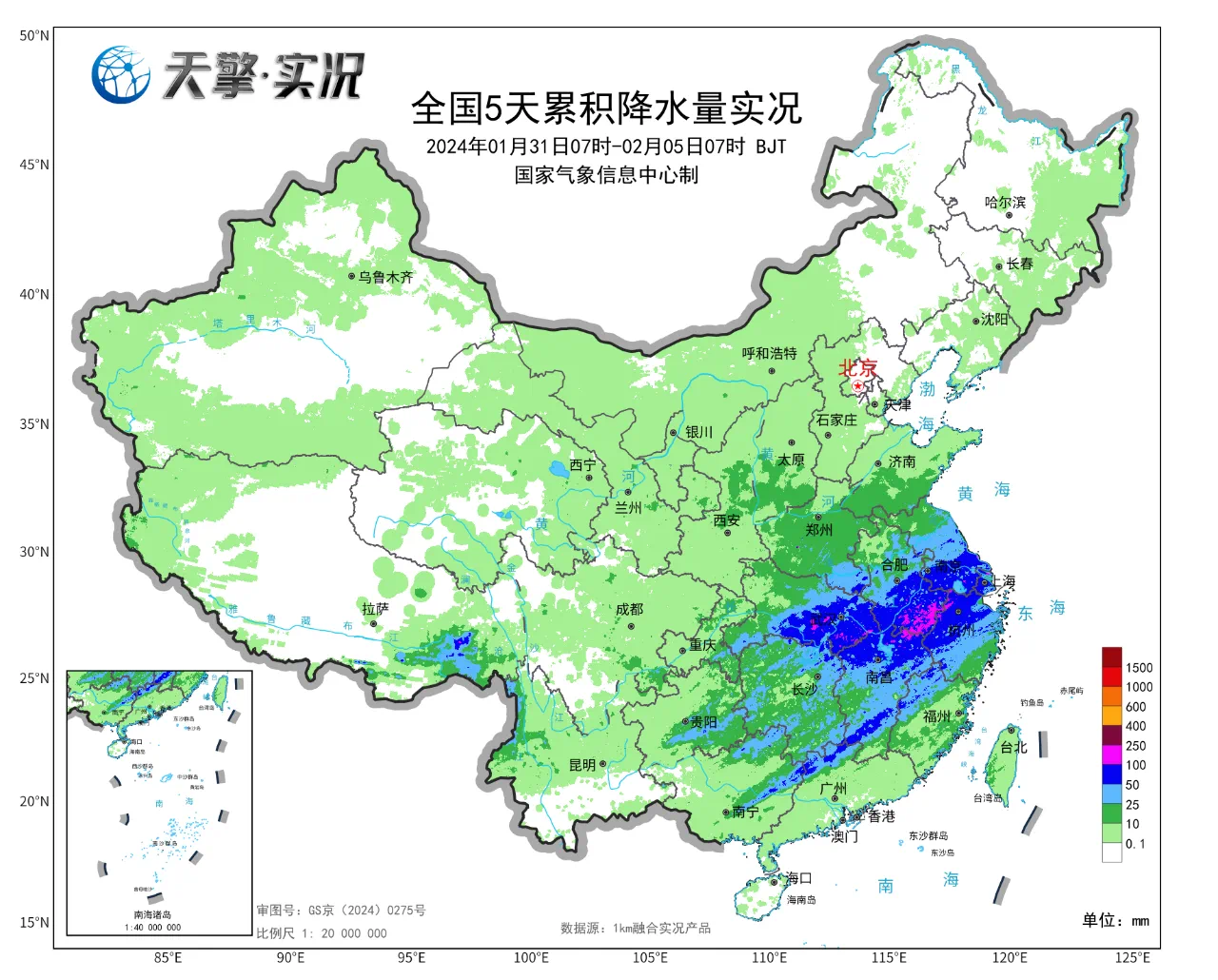 全国5天累积降水量实况。中央气象台供图