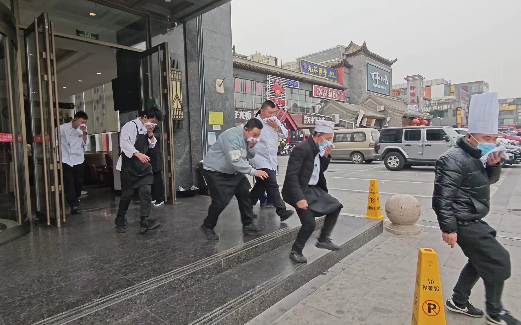 在万丰餐饮街的消防演练中,各家餐厅的安保人员迅速启动固定消防设施,第一时间组织人员撤离,微型消防站人员利用室内消火栓和灭火器进行灭火,同时拨打119报警。5分钟后,参演餐厅全体员工安全撤离。