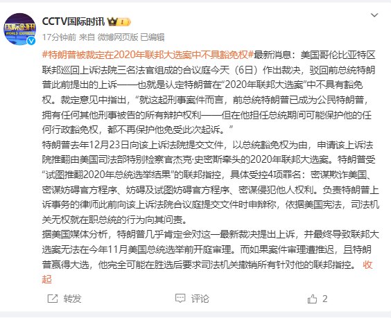 据@CCTV国际时讯消息,美国哥伦比亚特区联邦巡回上诉法院三名法官组成的合议庭今天(6日)作出裁决,驳回前总统特朗普此前提出的上诉——也就是认定特朗普在“2020年联邦大选案”中不具有豁免权。裁定意见中指出,“就这起刑事案件而言,前总统特朗普已成为公民特朗普,拥有任何其他刑事被告的所有辩护权利——但在他担任总统期间可能保护他的任何行政豁免权,都不再保护他免受此次起诉。”