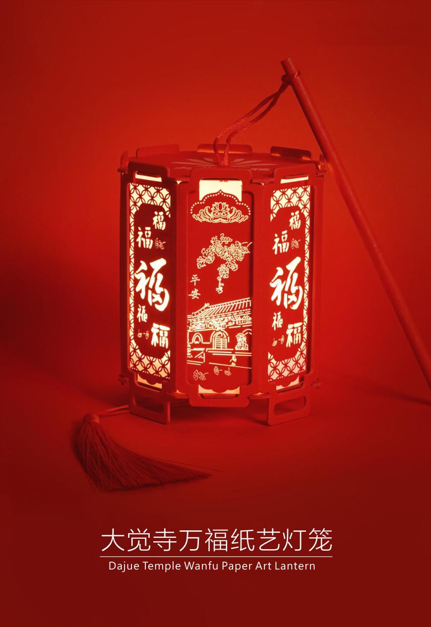 万福纸艺灯笼是大觉寺的缩影,更是文化的传承。它以大觉寺的山门、白塔、钟楼为设计蓝本,巧妙地将其融入镂空的红色纸雕,宛如一件精雕细琢的艺术品。这款灯笼不仅趣味盎然,更添了喜庆的氛围,无论是悬挂于厅堂,还是持于手中,都能增添别样的雅致。