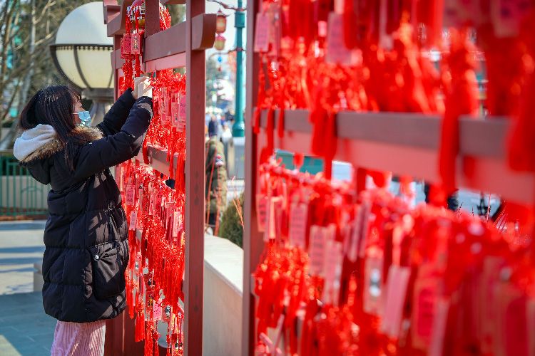游客悬挂许愿牌,许下新年愿望。温馨提示:环球度假区将于2024年2月9日至2月15日,基于天气情况对霍格沃茨城堡夜间魔法庆典特效进行试演和优化。如遇现场临时管控,请遵从工作人员指引。