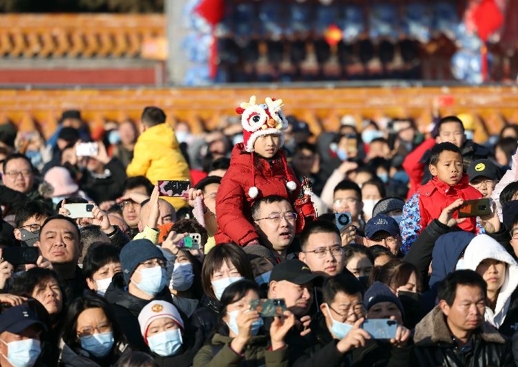 市民观看仿清祭地表演。庙会还邀请了5支国家级、省级非遗民间花会队伍,以及京内优秀舞龙团队为游客表演沧州舞狮、盖州高跷、威风战鼓等,让游客感受到历史悠久的文化和喜庆热闹的年味。