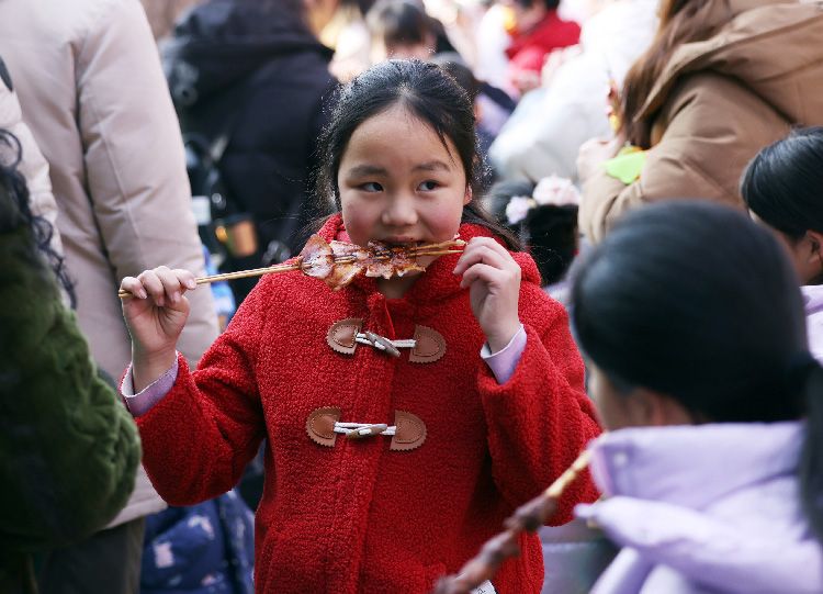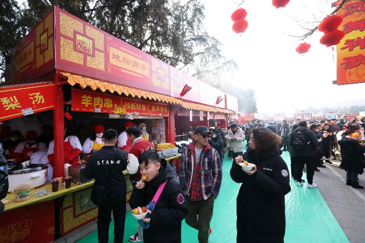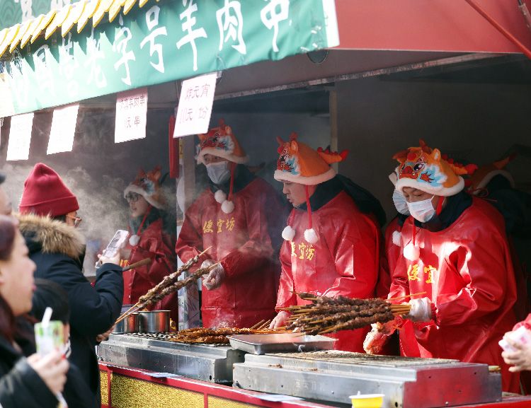 地坛庙会上的烤串摊位。老字号及非遗项目入驻是今年庙会的特色亮点,吴裕泰、北冰洋、东来顺、稻香村、故宫文创等多家老字号与知名品牌的入驻,提升了庙会品质,促进了消费。
