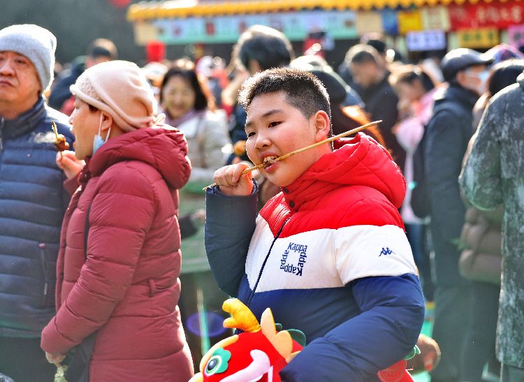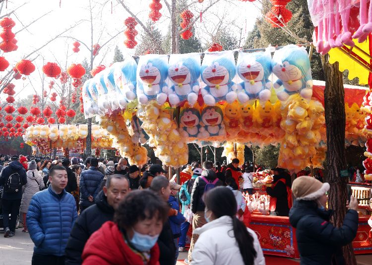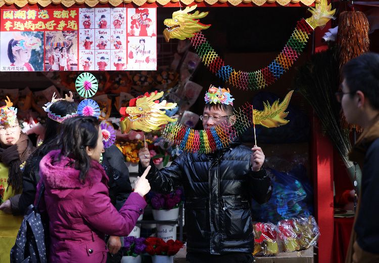2月11日,地坛庙会,游客购买舞龙拉花。庙会上,泥人张、鸽哨、景泰蓝、毛猴、兔儿爷、皮影等精品手工艺品琳琅满目,北京蒙镶、糖画、漆雕、山桃木雕、剪纸、内画、木版年画等非遗制作技艺传承人齐聚一堂,展现老北京民俗文化与生活趣味。