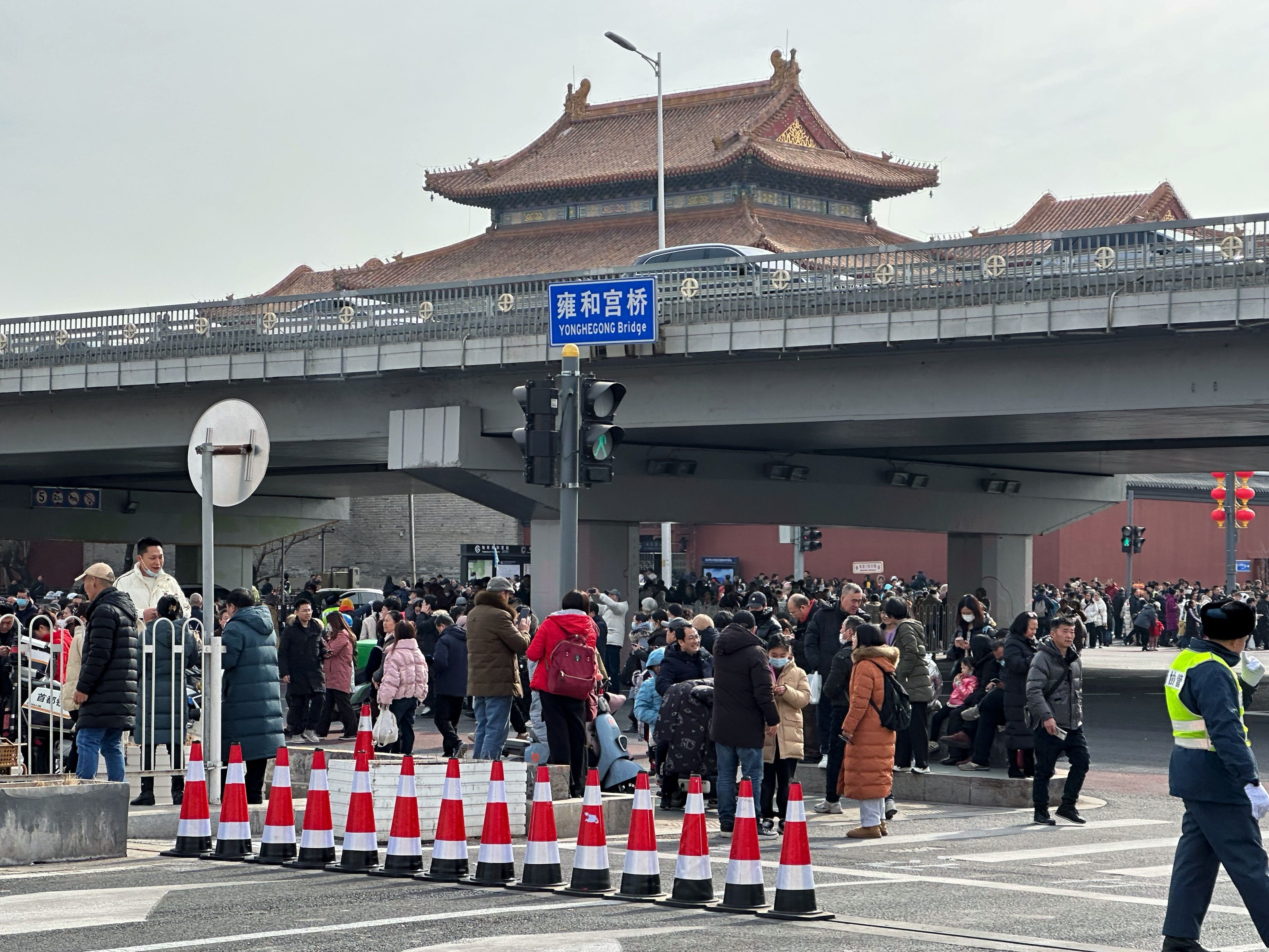 今天12时,北二环雍和宫桥下挤满了行人,很多人正在等候网约车,此时地铁雍和宫站已经封站。新京报记者 裴剑飞 摄
