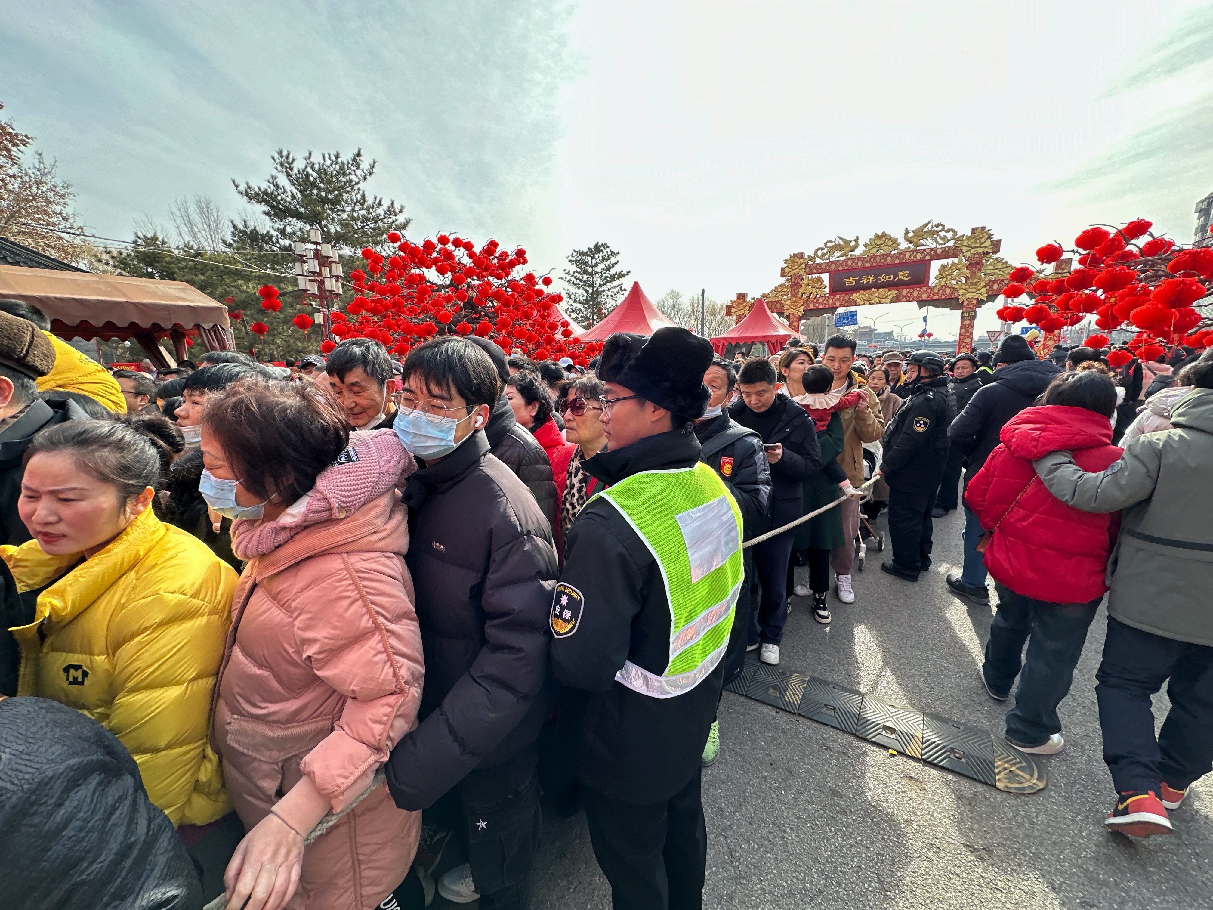 今天记者在地坛庙会周边注意到,由于游客数量非常多,地坛公园南门外很早就排起了长队。12时,南门外的游客数量达到了峰值,预计排队入园时间在1小时以上,周边道路采取了交通管制措施,交管部门也在全力疏导交通。