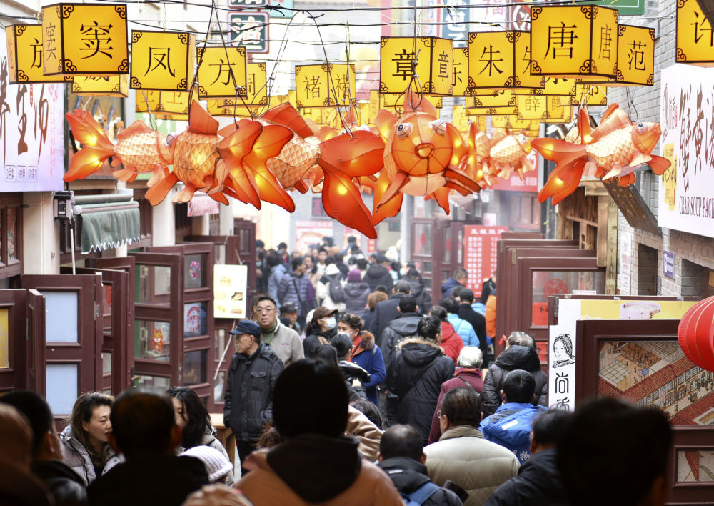 2月14日,游客在山东省青岛市市南区劈柴院内游览。新华社发(杜春来 摄)