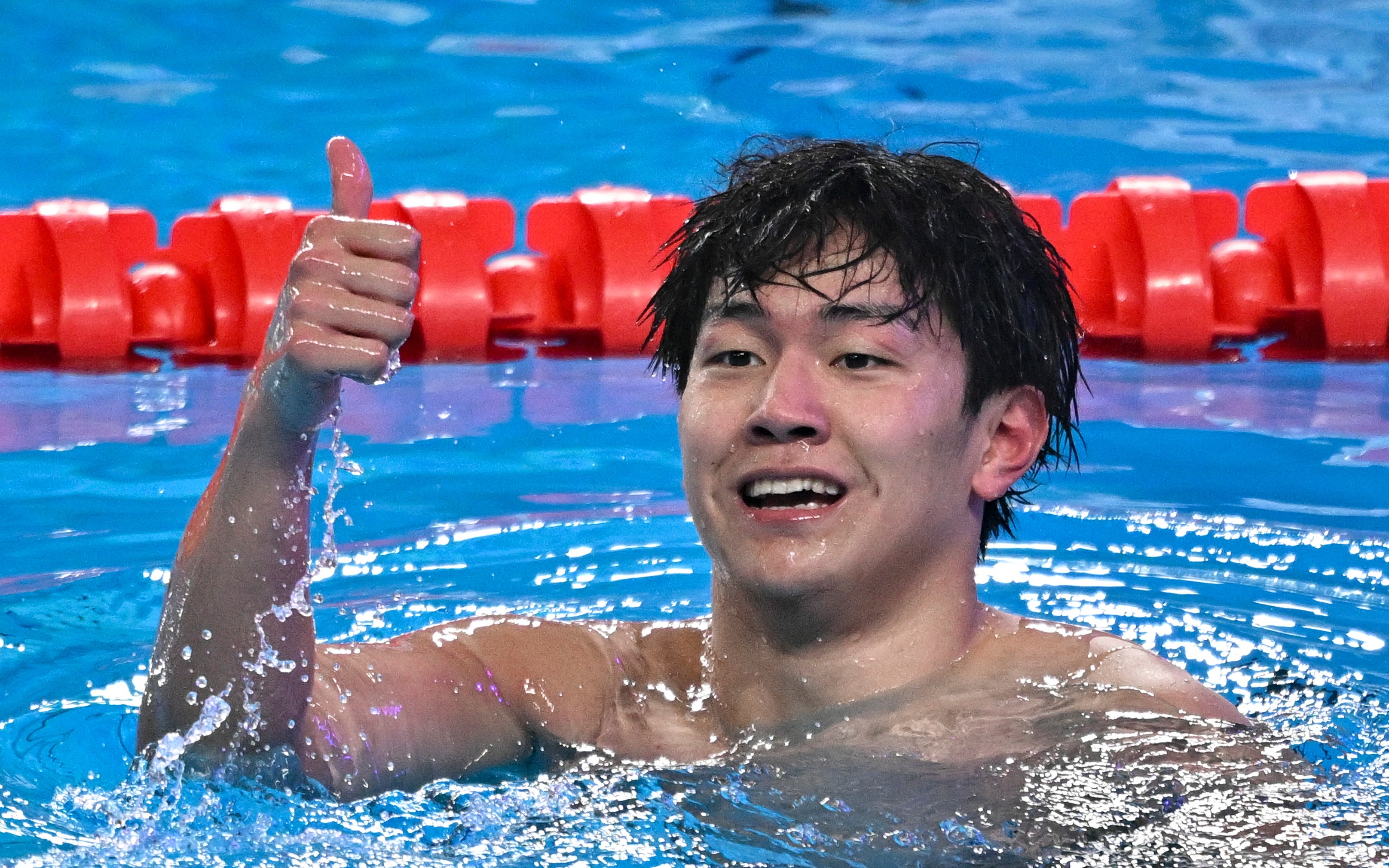 董志豪摘金的半小时后,男子4×200米自由泳接力决赛打响。中国队派出了男子4×100米自由泳接力的夺冠阵容,只是棒次作出调整。美国队从第一棒开始领先,中国队则从第一棒开始追赶——开棒的季新杰以第4位到边,王浩宇在第二棒追至第2位,第三棒的潘展乐虽然未完成反超,但大幅缩小了与美国队的差距。16岁小将张展硕最后一棒出战,他与韩国名将黄宣优先后在最后50米反超美国选手,并以0.01秒的优势率先触壁,为中国队斩获男子4×200米自由泳接力金牌。
