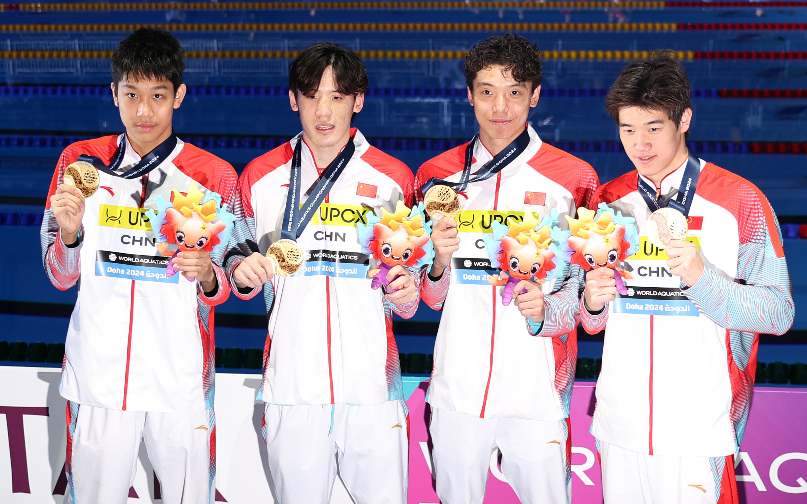 张展硕、王浩宇、季新杰和潘展乐(从左到右)在颁奖仪式后合影。 图/新华社