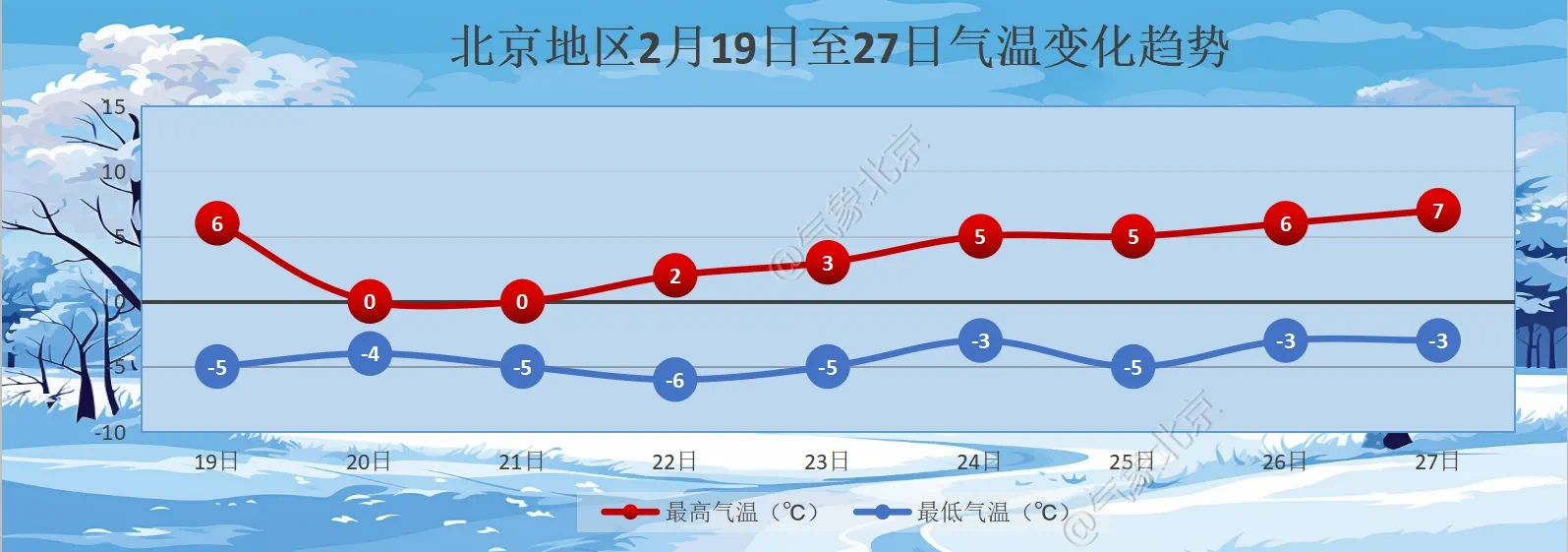 未来几天阳光缺席,气温下跌,20日到23日最高气温仅为0~3℃。24日开始,北京天气转晴,气温缓慢回升。据北京市气象台预计,南郊观象台从2月19日到27日最高气温为0~7℃,最低气温为-6~-3℃。