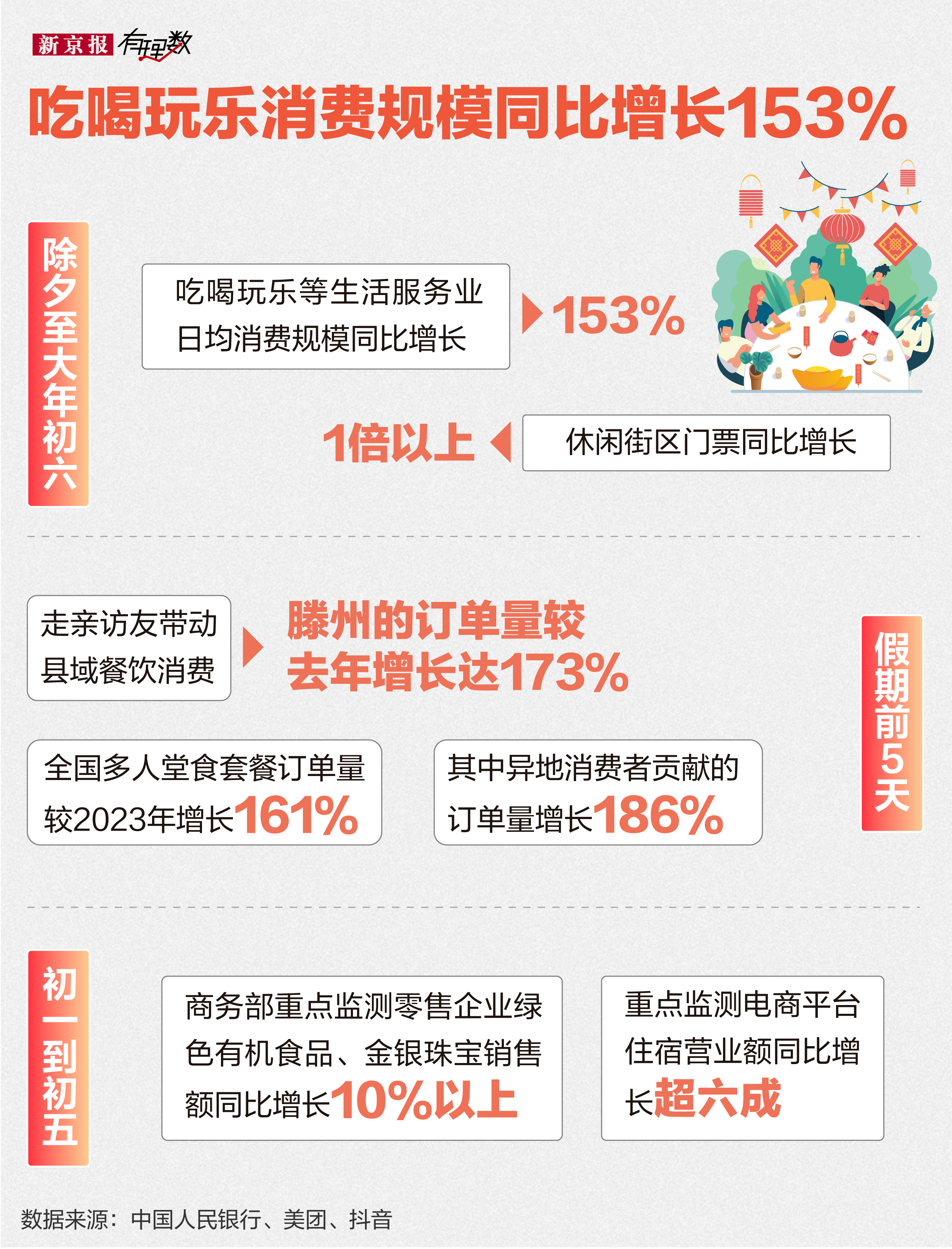 吃喝行娱购,在出游市场的带动下,餐饮、交通、住宿、零售等行业也迎来了大批客流。商务部数据显示,春节期间节庆商品销售红火,商务部重点监测零售企业绿色有机食品、金银珠宝销售额同比增长10%以上,电商平台住宿营业额同比增长超过六成。