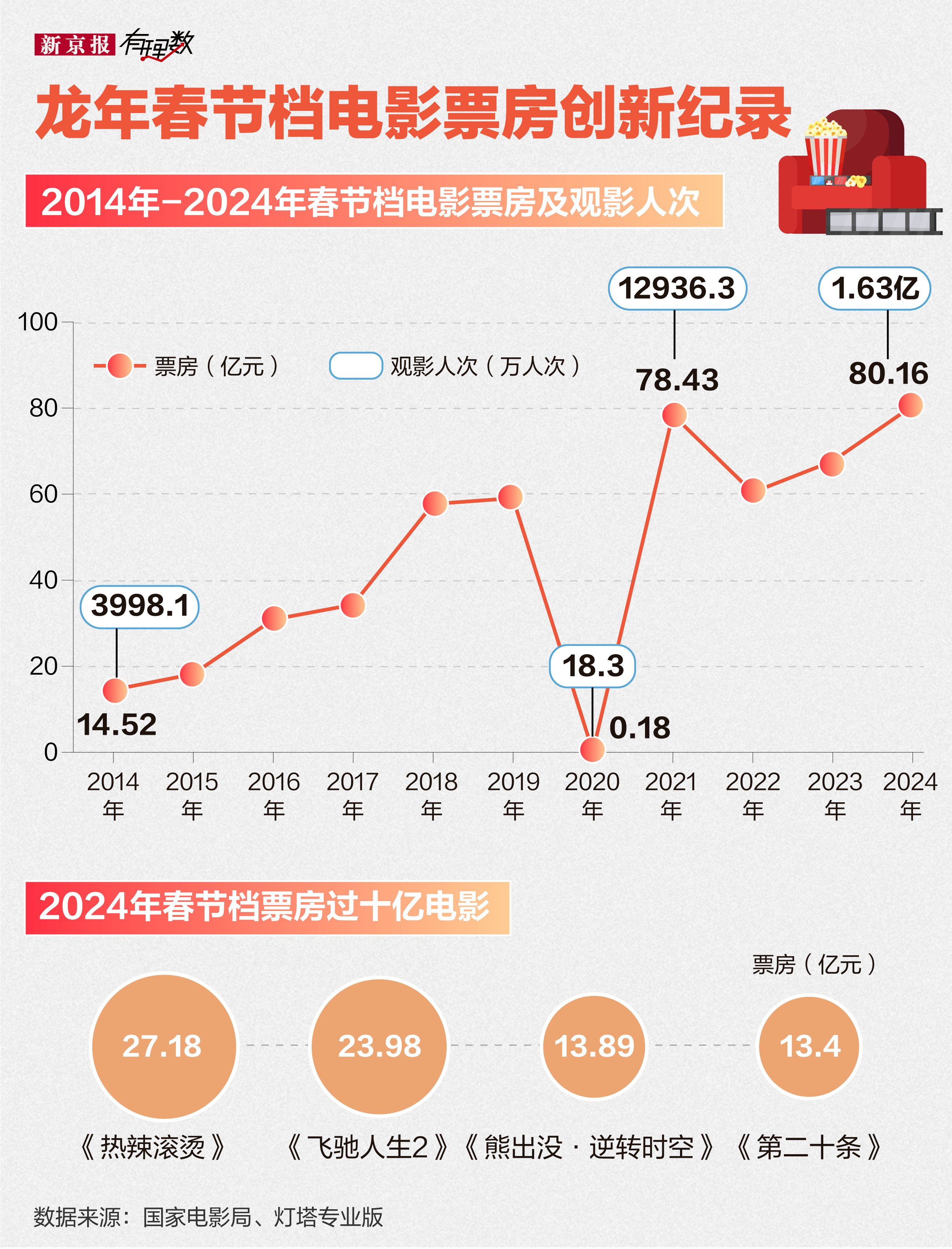 国家电影局初步统计,2024年春节期间(2月10日至2月17日)全国电影票房为80.16亿元,观影人次为1.63亿,刷新了中国影史春节档票房、场次、人次纪录。龙年电影市场迎来“红红火火”的开门红。