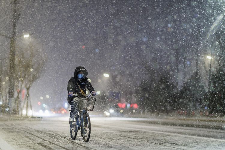 2月20日晚,通州区通朝大街,市民在雪中小心翼翼地骑车。