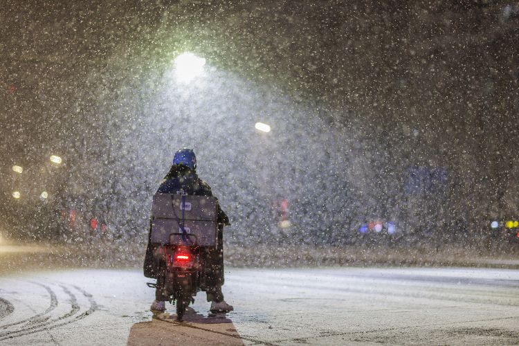 2月20日晚,通州通朝大街,外卖小哥在雪中等待红绿灯。北京市气象台于18时30分发布道路结冰黄色预警信号,目前,本市大部分地区已出现降雪天气,预计当前至21日17时,地表温度低于0℃,大部分地区易形成道路结冰,请注意交通安全。