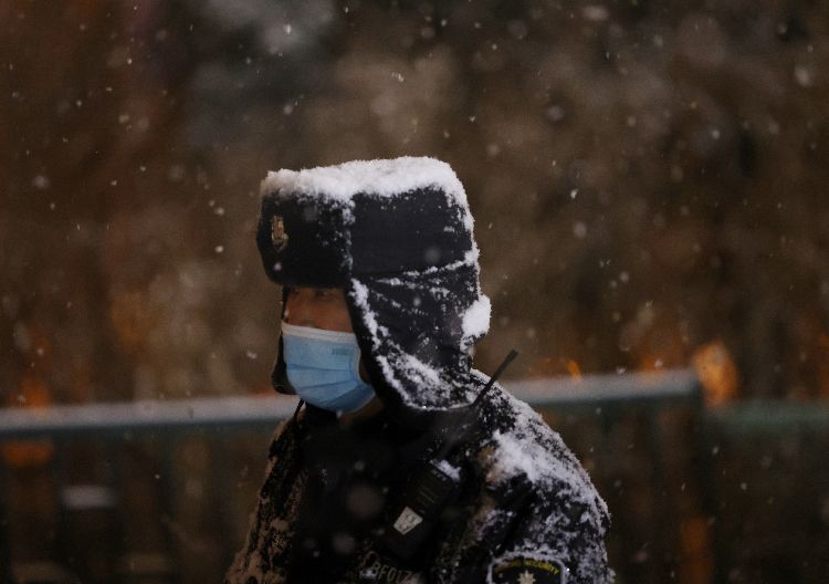2月20日晚,东城区少年宫,保安在雪中站岗。