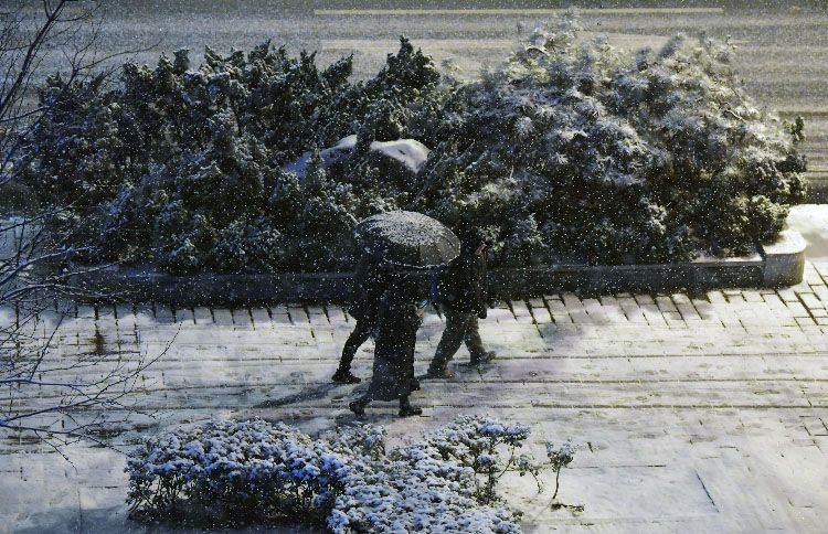 2月20日晚,海淀区知春路,市民在雪中匆匆赶路。
