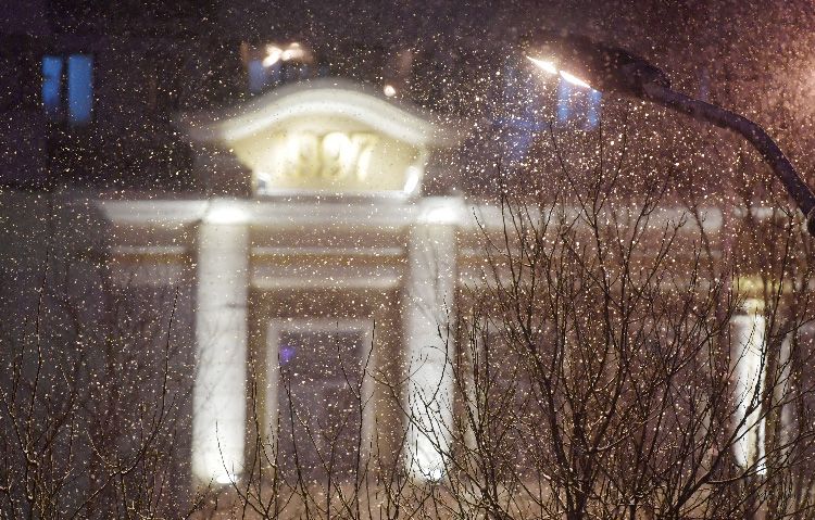 2月20日晚,东四十条,路灯下的片片飞雪。