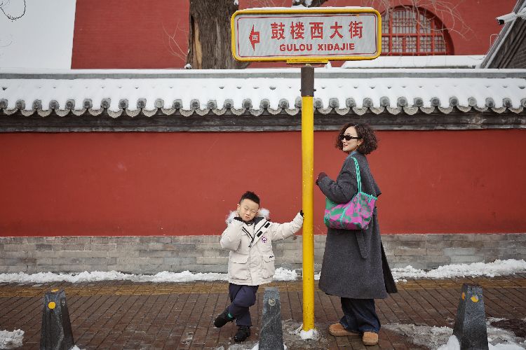 2月21日,鼓楼,一对母子在白雪覆盖的红墙灰瓦前留影。