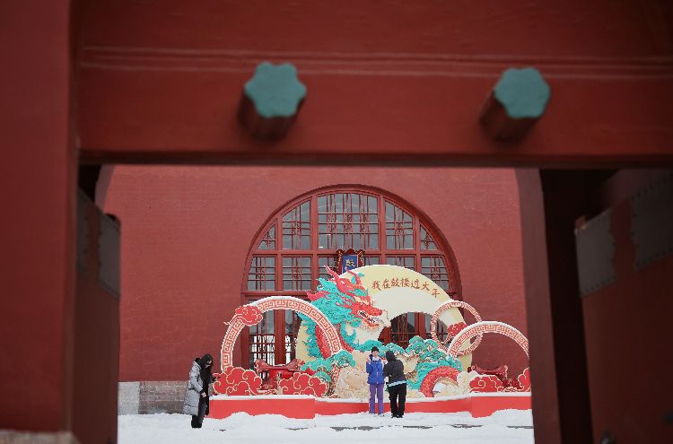 2月21日,鼓楼,游客在龙年新春装置前留影。