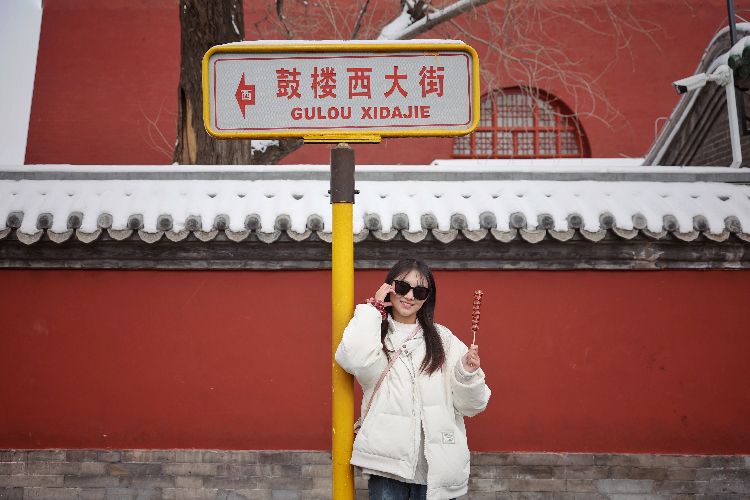 2月21日,鼓楼西大街,游客举着冰糖葫芦打卡雪后鼓楼。