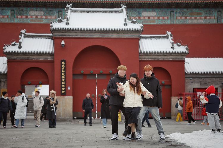 2月21日,姐弟三人在北京钟鼓楼广场上拍照。