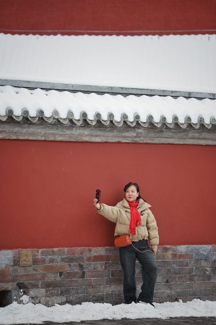 2月21日,一位游客在雪后红墙前自拍。