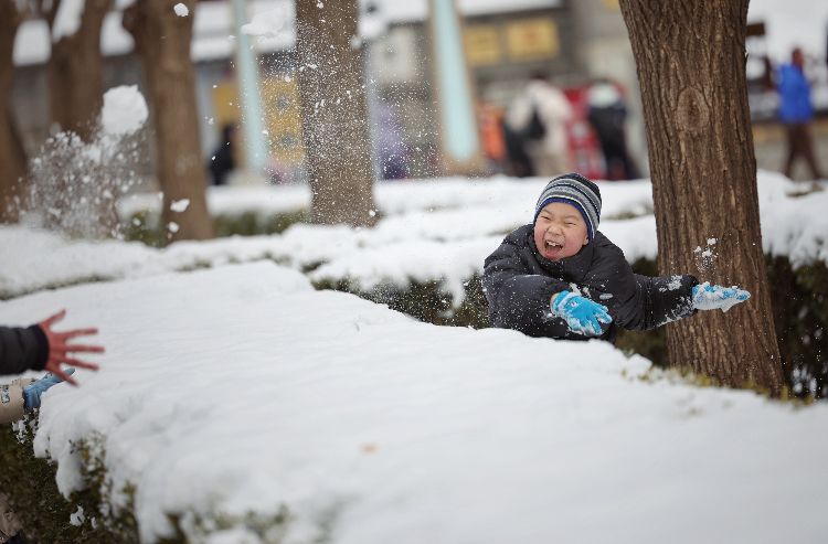 2月21日,一位小男孩在鼓楼前打雪仗。