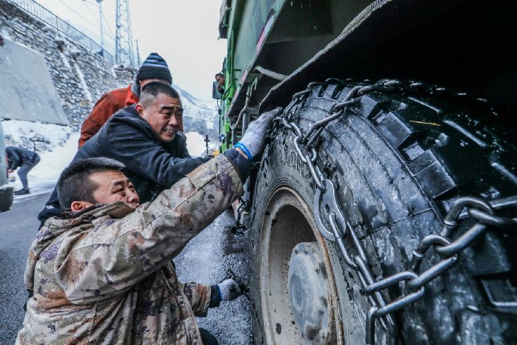 2月21日,房山区,作业车辆在出发前安装防滑链。