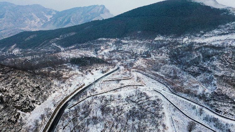 2月21日,房山区,俯瞰被积雪覆盖的山区。