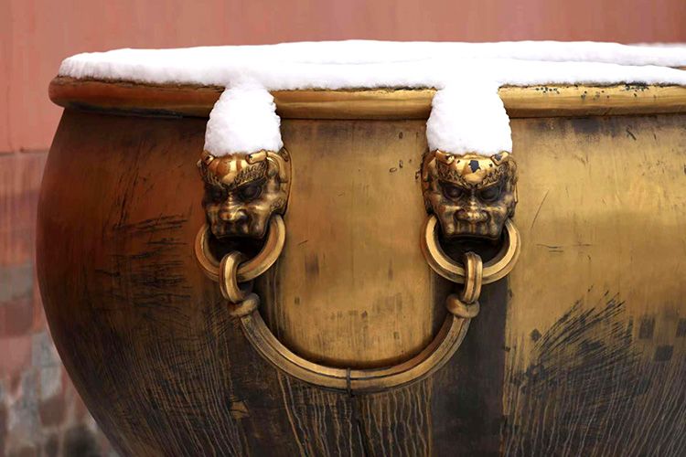 雪后,铜狮子都戴上了白色“高帽”,别有一番情趣。