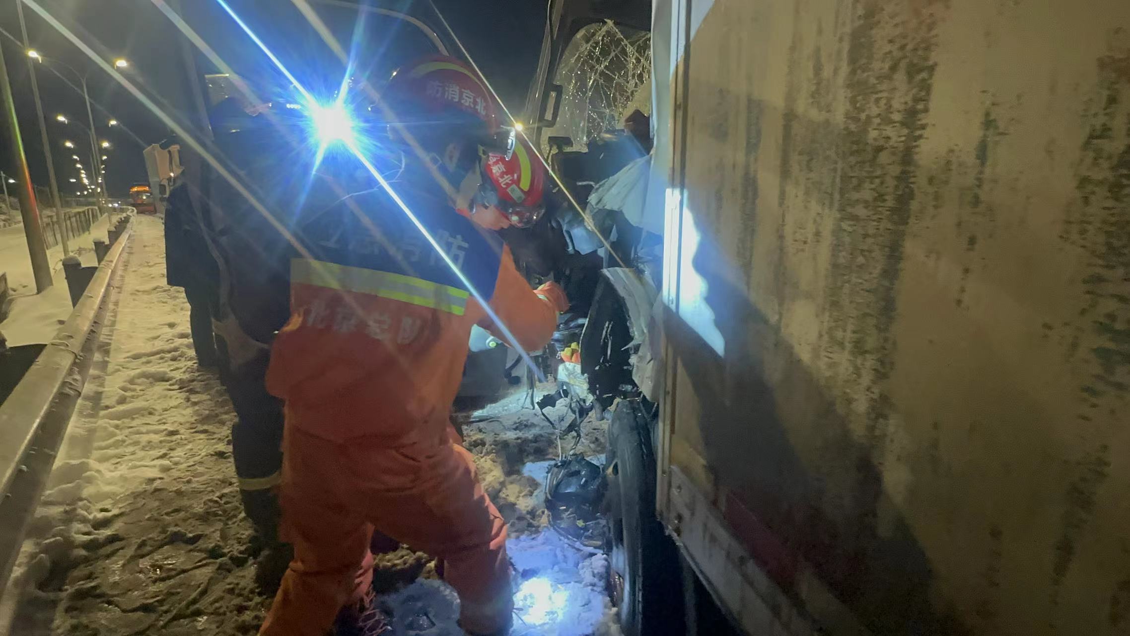 2月21日4点36分,大兴区消防救援支队接到119指挥中心调度命令,位于南五环西向东方向下南中轴路闸道处发生交通事故,有人员被困的警情,西红门特勤站接警后立即赶赴现场。