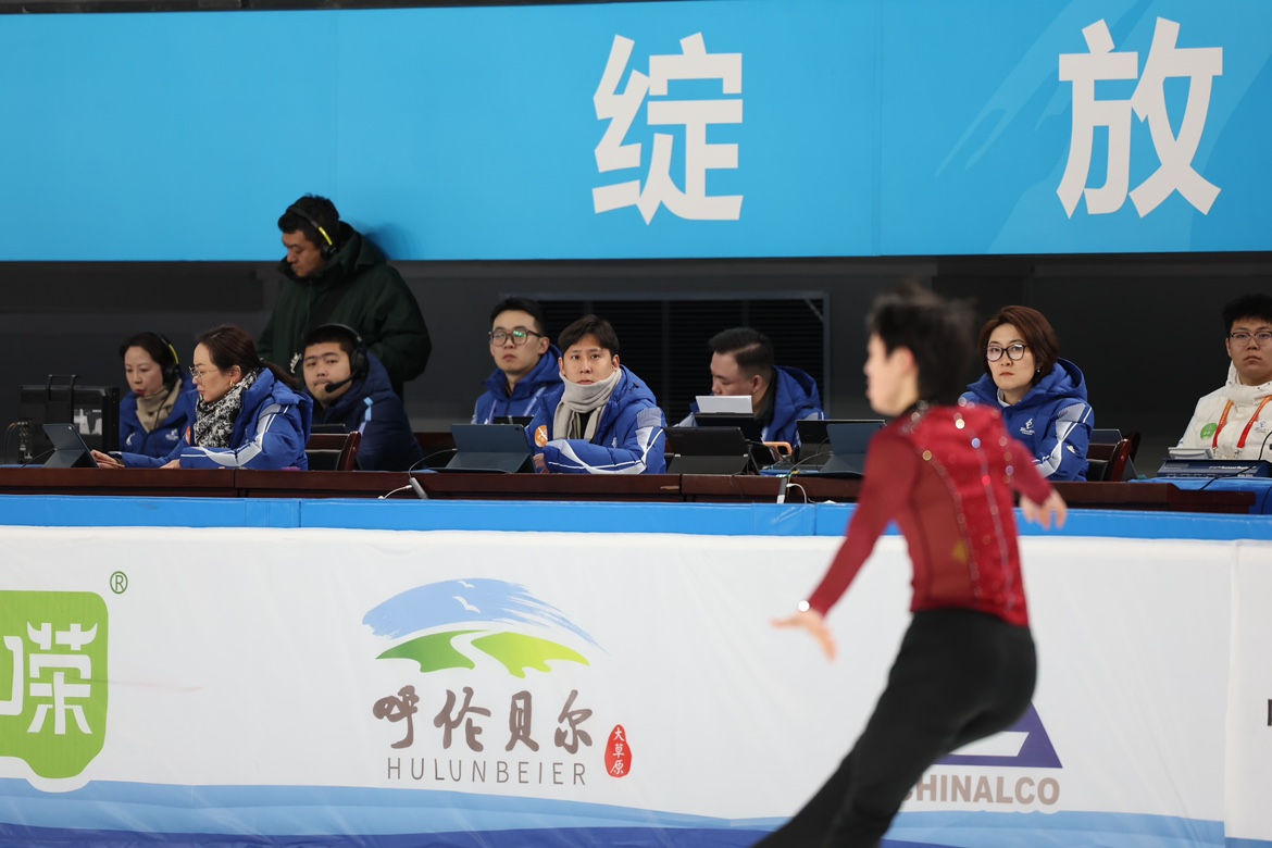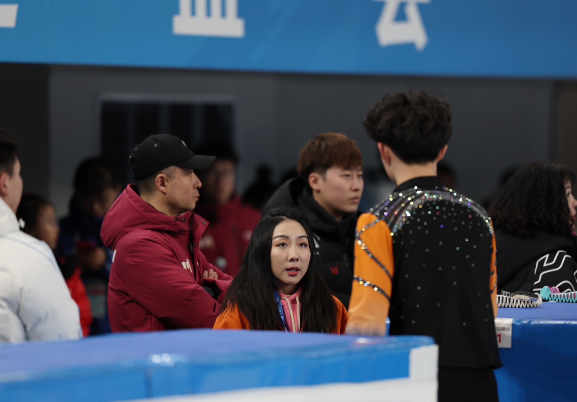 隋文静在场边盯着弟子们比赛时,昔日搭档韩聪则坐在技术官员席上,同样关注着场上运动员的每一个动作是否标准。