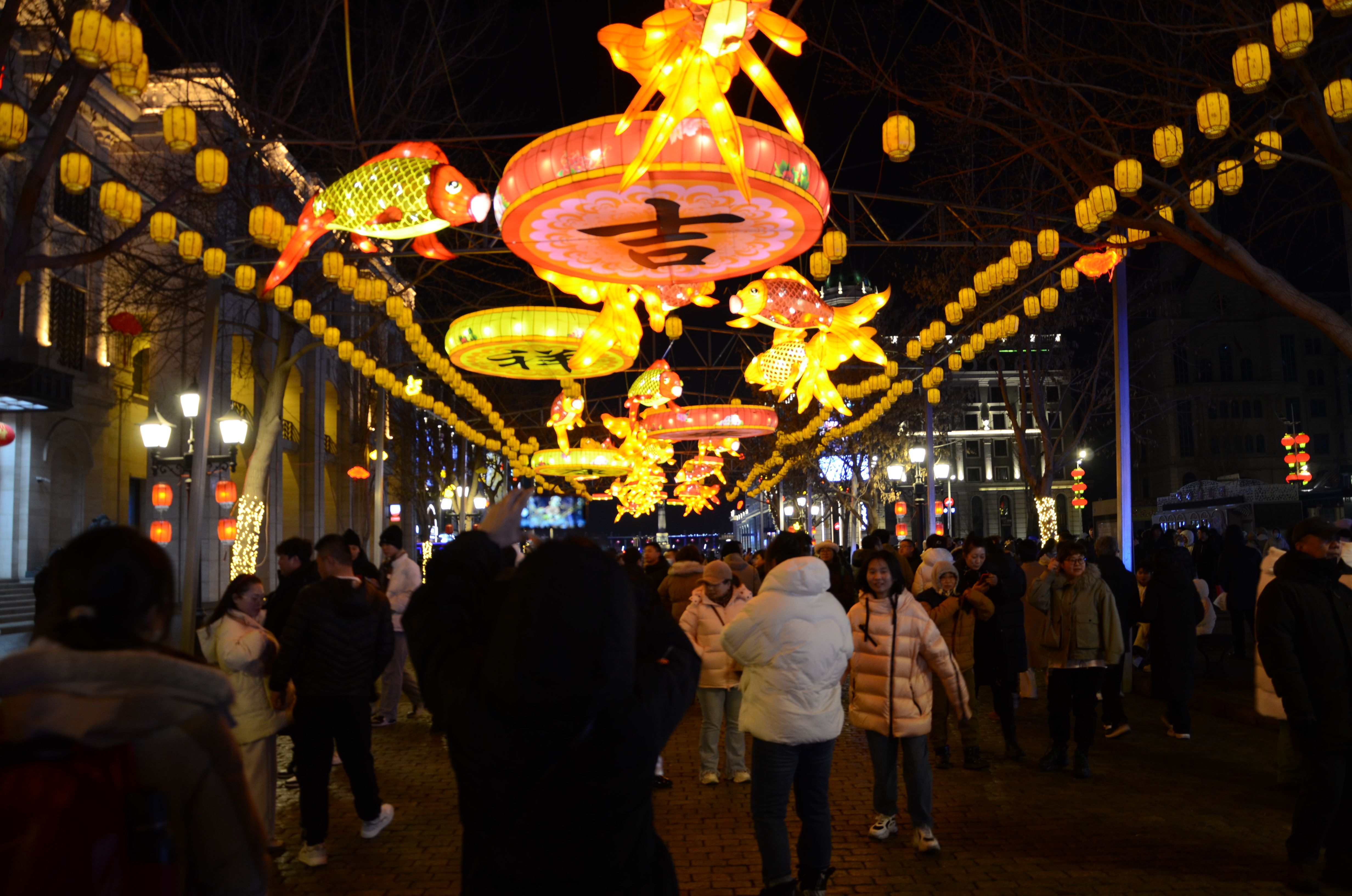 2月17日晚上9点多,哈尔滨中央大街上的游客依然络绎不绝。新京报记者 左琳 摄