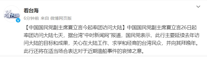据@看台海微博消息,中国国民党副主席夏立言26日起率团访问大陆七天,据台湾“中时新闻网”报道,国民党表示,此行主要延续去年访问大陆的目标和成果,关心在大陆工作、求学和经商的台湾民众,并向其拜晚年。此行还将在适当场合表达对于近期渔船事件的哀悼之意。