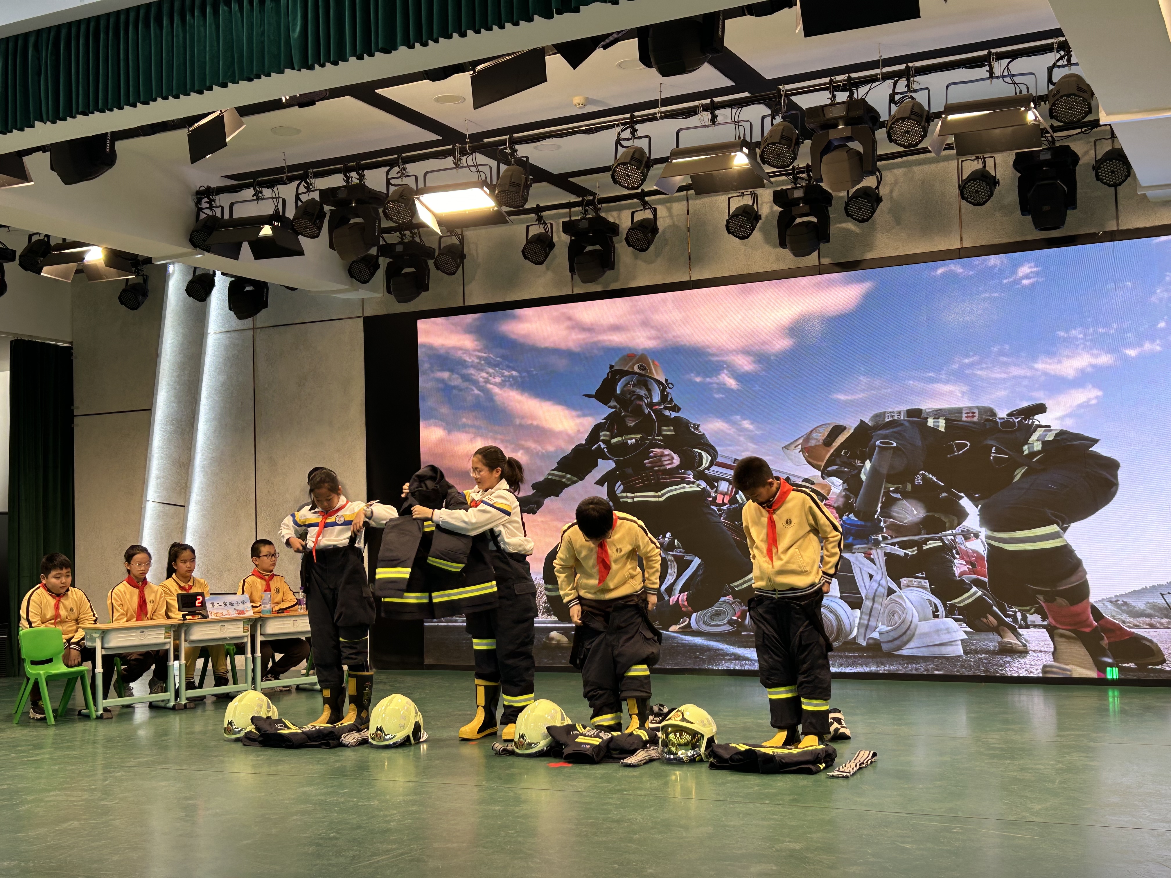 主持人在比赛开始前告知,比赛共分为“我是小小战斗员”“我是小小监督员”“我是小小通信员”“我是小小消防员”这四个项目。在第一个项目正式开始前,两名消防员向在场的学生、老师和家长们演示了如何正确穿着消防灭火战斗服,战斗服包括上衣、裤子、靴子、腰带、头盔、手套等等。经过演示后,“我是小小战斗员”项目开始,四支参赛队伍派出代表,模仿消防员穿着消防灭火战斗服,比赛谁穿得快。