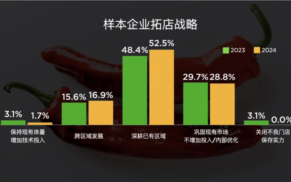 在样本企业中,两成计划2024年保持平稳发展。超过七成样本企业明确表示有开店扩张计划。对比2023年,样本企业拓店的态度更为乐观,52.5%企业选择在已有区域深耕,相对于2023年的48.4%有所提升;28.8%的样本企业将巩固现有市场,不断增加投入、内部优化;16.9%的样本企业将跨区域发展;1.7%的样本企业将保持现有体量,增加技术投入。