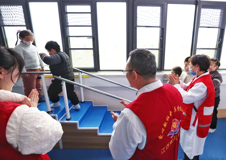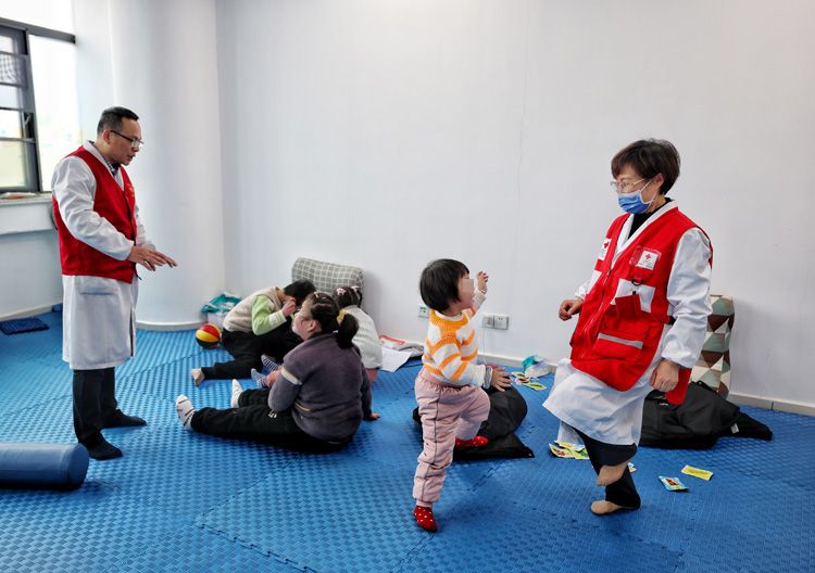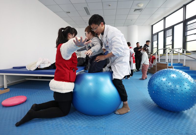 2月29日,患儿在医院康复科进行康复指导训练。中国红十字基金会成长天使基金联合合作医疗单位在全国各地举办“为爱呐罕·让爱不凡”罕见病日系列公益活动,邀请生长发育等领域的专家和医务人员,通过公益援助、科普讲座、健康义诊等形式,关心关爱罕见病群体生长发育的相关问题,并向社会公众倡导凝聚社会力量,用爱温暖罕见病患者的前行之路。