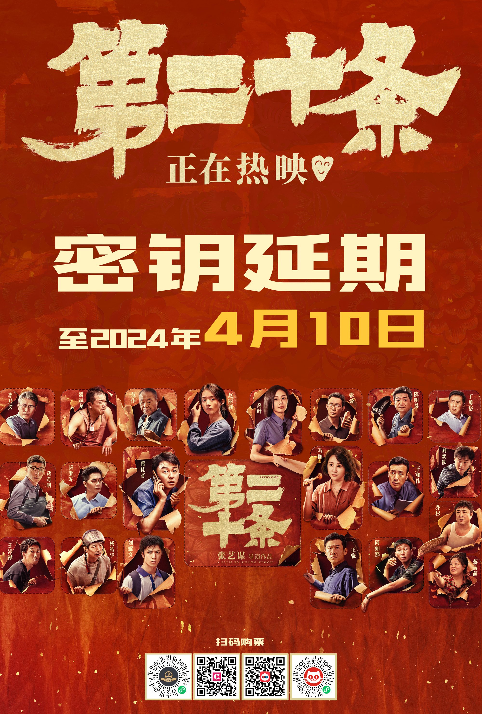 电影《第二十条》由张艺谋执导,雷佳音、马丽领衔主演,赵丽颖特别主演,高叶领衔主演,刘耀文、王骁、陈明昊、潘斌龙主演,张译、范伟、于和伟友情出演,于2024年大年初一在全国上映。影片目前上映24天,累计票房22.91亿元。