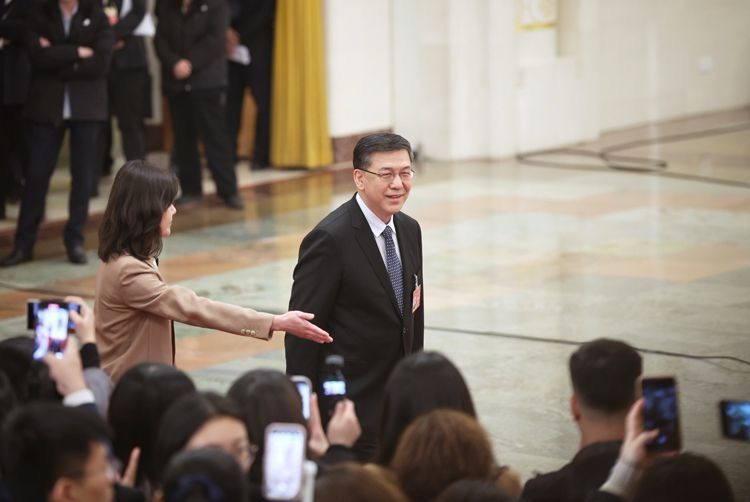 科技部部长阴和俊进入“部长通道”。 新京报记者 薛珺 摄