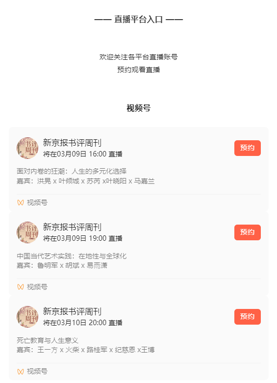 3月9日-10日(周六、日),新京报书评周刊·文化客厅将与牛津中国论坛联动,直播其中的三场论坛,即以“⾯对内卷的狂潮: ⼈⽣的多元化选择”“中国当代艺术实践:在地性与全球化”“死亡教育与人生意义”为主题的三场。其他更多分论坛直播,欢迎关注牛津中国论坛官方信息。