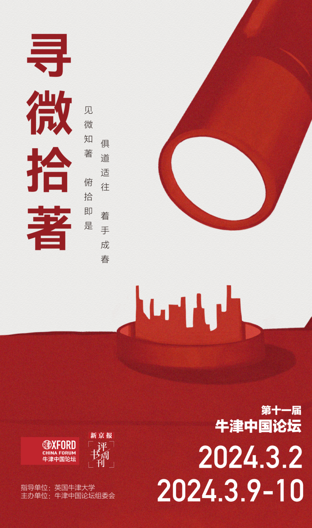 第十一届牛津中国论坛以“寻微拾著”为主题,将从“面对内卷狂潮:人生的多元选择”“文旅新浪潮”“数字时代的公共空间”“中国当代艺术实践:在地性与全球性”“当代青年的精神景观与心理抗衡”“AI x Law:共商智能时代法律秩序构建方案”“新家庭视角下的家庭变革”以及“死亡教育与人生意义”8个主题,对当下的多个社会现象展开深入讨论。